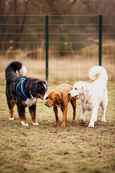 Unbekannte Hunde starten mit Maulkorb oder an lockerer Schleppleine, sodass Annäherungen kontrolliert beginnen. Tempo und Intensität orientieren sich an der jeweiligen Situation – im Mittelpunkt stehen ruhige, lockere Kontakte.